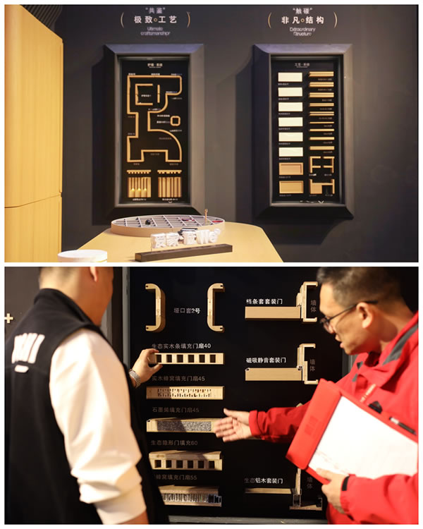 作為此次展會的"現象級"展品,鵬鴻工法墻以模塊化系統思維,通過"解構式"陳列,將工藝系統、木門系統與護墻系統整合,58個工藝模塊覆蓋結構、裝飾與功能三大維度,清晰呈現全屋定制的工藝系統。